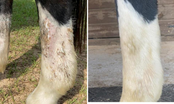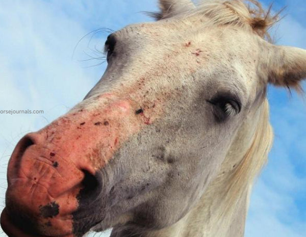 Horses with white muzzles are especially susceptible. Symptoms often include pink, crusty, or flaky skin on white facial markings.